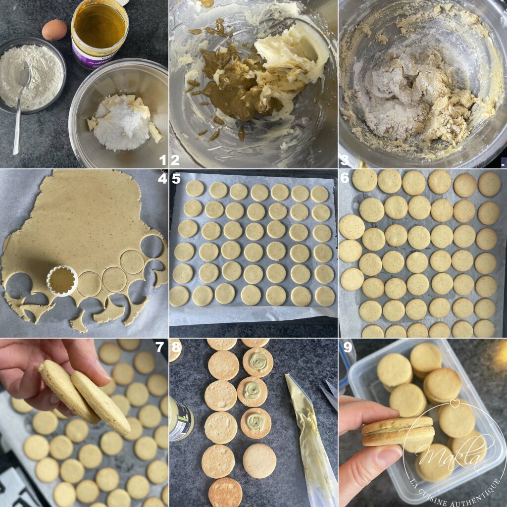 Prendre un biscuit et y déposer à l’aide d’une poche à douille ou d’une cuillère de la pâte à tartiner à la pistache (étape 8).