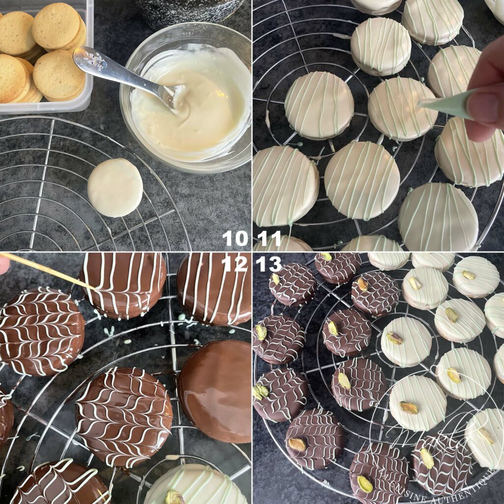 Tremper chaque biscuit dans le chocolat, le secouer un peu pour ôter l’excédent et déposer le biscuit sur une grille (étape 10).