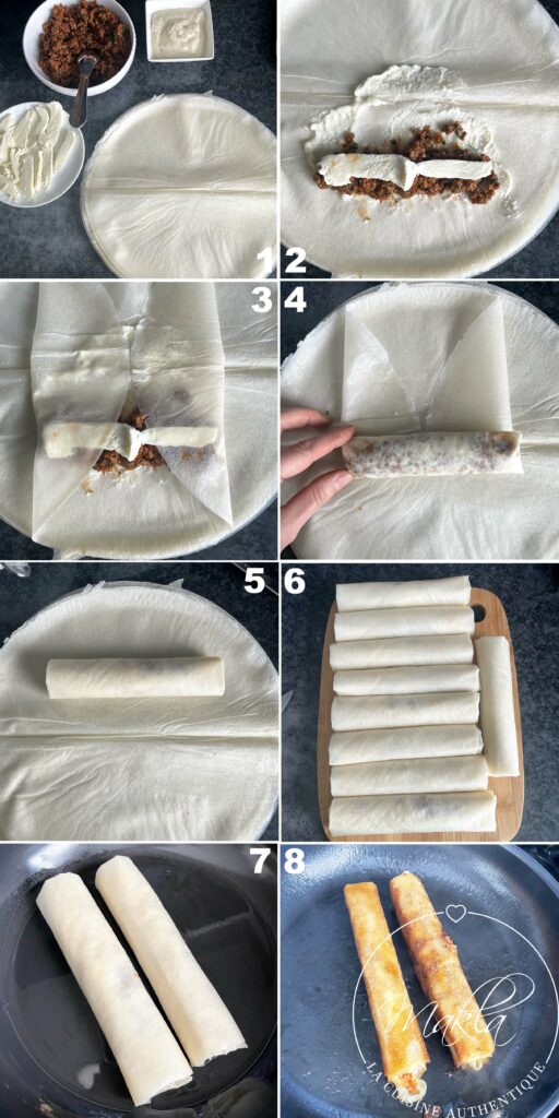 Déposer les rouleaux sur une assiette, fermeture vers le bas et répéter l’opération jusqu’à épuisement de la farce et / ou des feuilles de bricks (étape 6).