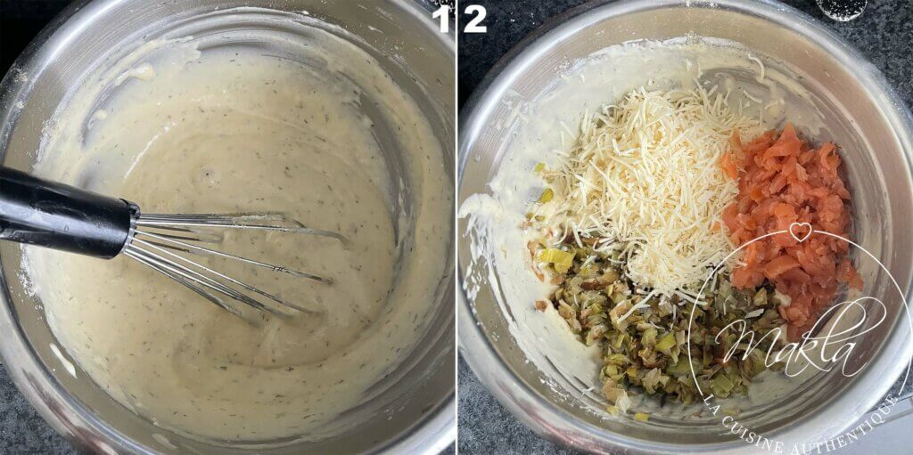 Incorporer ensuite le gruyère râpé, mélanger, puis ajouter le saumon et les poireaux (étape 2).