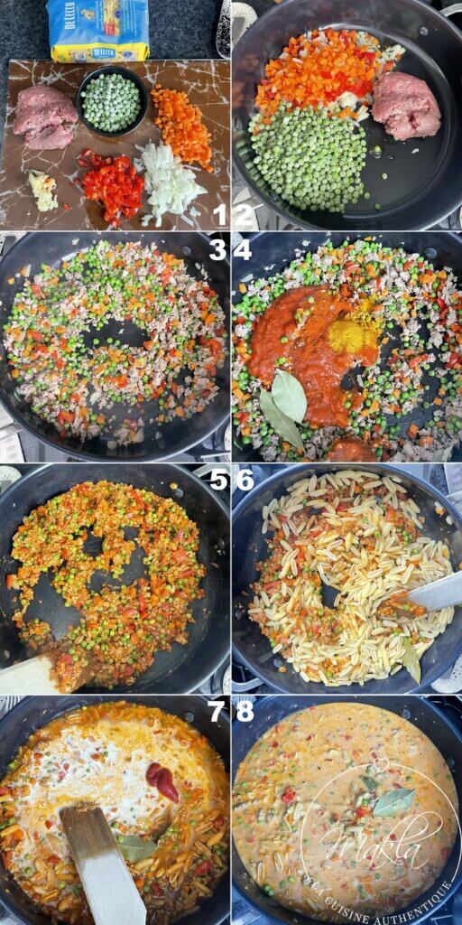 Commencer par faire revenir la viande hachée avec l’oignon, l’ail, les carottes, les poivrons et les petits pois dans une poêle avec un filet d’huile d’olive. Laisser cuire 5 minutes (étapes 2 et 3).